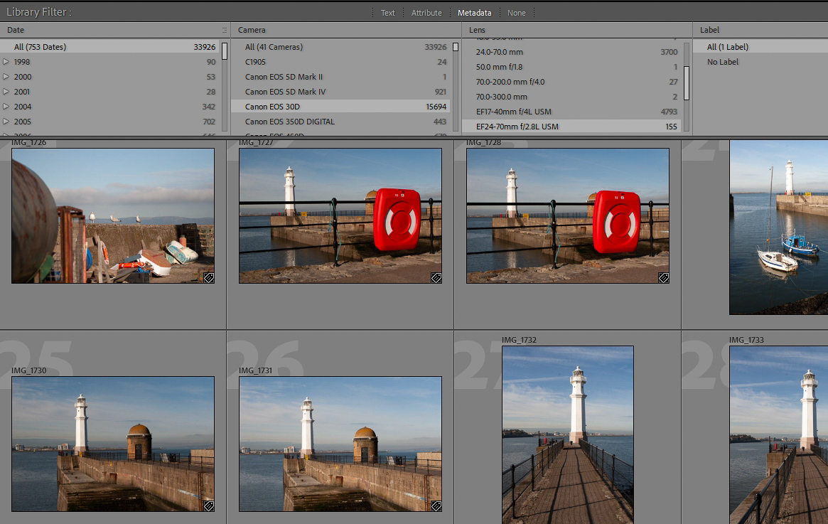 The screenshot below is a very basic example of filtering by metadata, where I’ve used the Lightroom application to filter photos by year , camera, and lens. All the data is contained in the images themselves, and Lightroom is making use of this to allow me to organise and search more effectively.