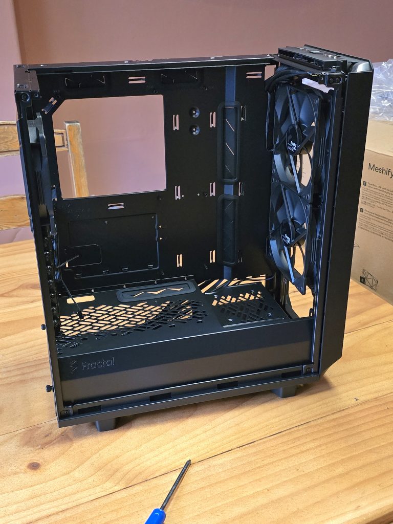 Cases come in different sizes. You’ve got your massive full towers (the mansions of the PC case world), your much more compact mini towers, and then there’s the Mid Tower, which is the Goldilocks sweet spot. I went with the Meshify 2 Compact. Not too big, not too small, just right for sitting at the end of my desk. It also looks good too, with a lightly tinted glass side panel that lets you gawk at the PC’s innards.
