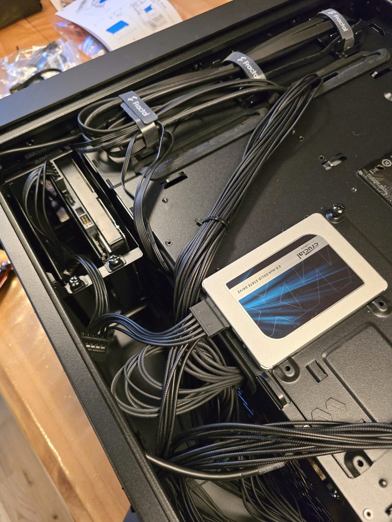 What does SATA mean? SATA stands for Serial Advanced Technology Attachment but you don’t need to know that – it’s just one way for the computer to connect to storage devices like SSDs. Installing my SATA drives was a little tricky given the space restrictions at the bottom of the case, but with some patience I managed it without too many problems.