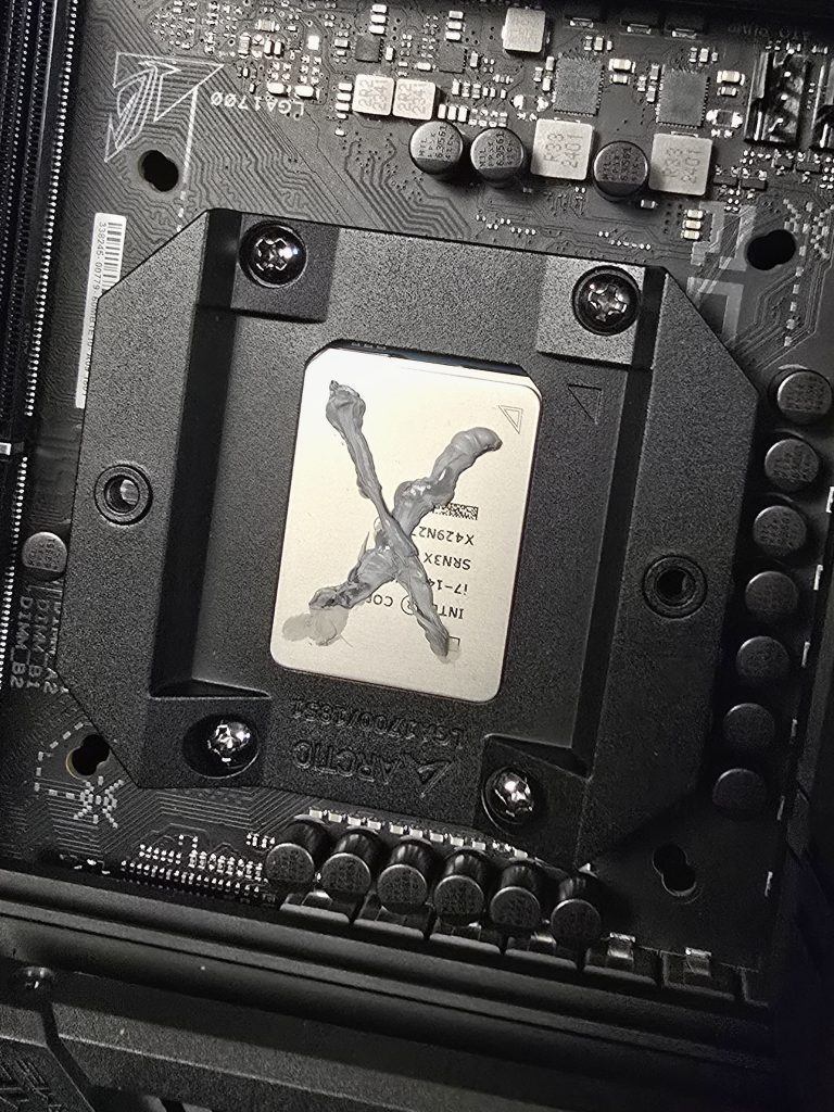 The ‘X’ shape was recommended in the Arctic manual – some coolers use a pea shaped blob of paste placed in the middle of the CPU.
