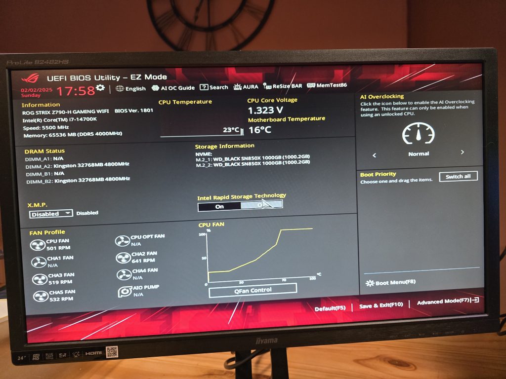 The BIOS utility shown above is fundamental for checking everything is working optimally. The programme provides information about the CPU temperature for example, and how your fans are performing – my fan information is at the bottom left. The X.M.P. setting (can’t remember and don’t care what that stands for!) allows you to run the RAM at higher speed – it’s disabled in the photo but I enabled it, and it’s now running at the optimal speed. The Storage Information in the middle of the screen correctly shows both my NVMe SSD drives for storage.